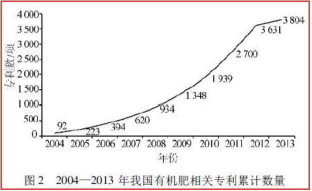 (3)我國(guó)有機(jī)肥相關(guān)專(zhuān)利累計(jì)數(shù)量呈現(xiàn)上升趨勢(shì)(圖 2),表明我國(guó)有機(jī)肥生產(chǎn)技術(shù)在迅速進(jìn)步和發(fā)展。