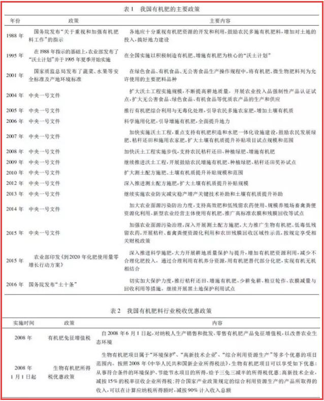 政策可以引導(dǎo)行業(yè)發(fā)展。近年來(lái),中央高度重視有機(jī)肥的施用情況,要求各地大力推廣施用有機(jī)肥。2004—2016 年,連續(xù)13 年發(fā)布以“三農(nóng)”為主題的中央一號(hào)文件,強(qiáng)調(diào)了“三農(nóng)”問(wèn)題在中國(guó)社會(huì)主義現(xiàn)代化時(shí)期“重中之重”的地位,有機(jī)肥作為農(nóng)業(yè)生產(chǎn)的重要環(huán)節(jié),除2011 年以外,12 次被納入歷年中央一號(hào)文件作為未來(lái)產(chǎn)業(yè)發(fā)展的重點(diǎn)。我國(guó)有機(jī)肥的主要政策和有機(jī)肥行業(yè)稅收優(yōu)惠政策分別見(jiàn)表 1 和表 2。