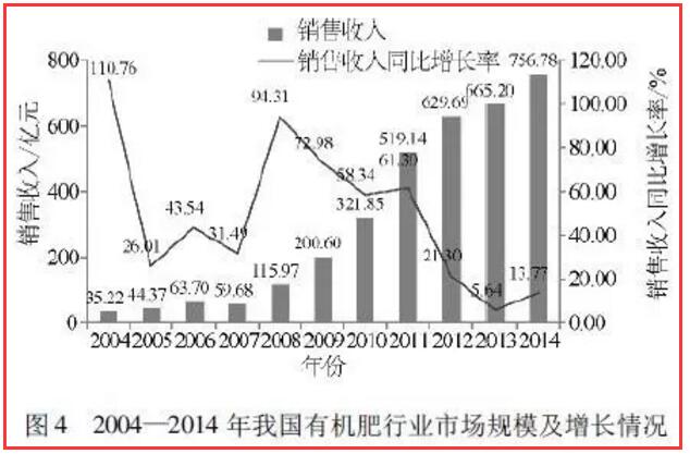 2002 年,我國(guó)制訂了有機(jī)肥行業(yè)標(biāo)準(zhǔn)NY525—2002,有機(jī)肥正式進(jìn)入流通領(lǐng)域,行業(yè)進(jìn)入了快速發(fā)展期。經(jīng)過(guò)五六年的初步發(fā)展,有機(jī)肥的生產(chǎn)技術(shù)趨于成熟,市場(chǎng)需求量不斷擴(kuò)大,產(chǎn)品豐富多樣,從2008 年開(kāi)始有了爆發(fā)式的發(fā)展,到2013 年平均銷(xiāo)售額以每年30% 的速度遞增。2004—2014 年我國(guó)有機(jī)肥行業(yè)市場(chǎng)規(guī)模及增長(zhǎng)情況如圖 4 所示。